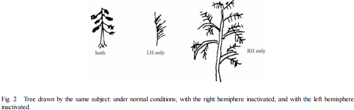 Examples abound illustrating these trait clusters. For instance, people with damage to their right hemispheres commonly exhibit pathological denial, intransigence, and irrational optimism. They'll stick to their existing point of view regardless of counter-evidence—even refusing to acknowledge deficits as severe as left-side paralysis after right-hemisphere stroke and making up bizarre excuses for not being able to move (anosognosia for hemiplegia). Delusions also tend to implicate right-hemisphere dysfunction. Another striking example illustrates how each hemisphere draws a tree, in a single person with the activity of one or the other temporarily suppressed. The LH version is not only an abstracted icon of a tree, it also totally ignores everything but the right side, i.e., what's graspable with the right hand which is controlled by the LH (hemispatial neglect).